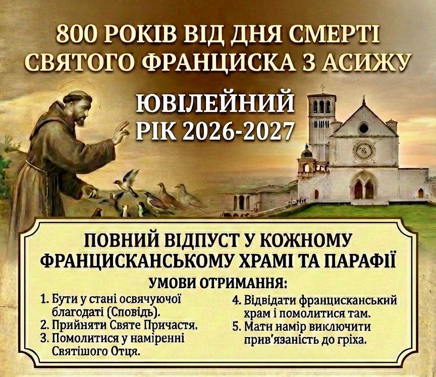 Декрет Апостольської Пенітенціарії з нагоди 800-ліття блаженної смерті Святого Франциска проголошує спеціальний Ювілейний Рік св. Франциска від 10 січня 2026 року до 10 січня 2027 року, протягом якого вірним надається можливість отримати повний відпуст